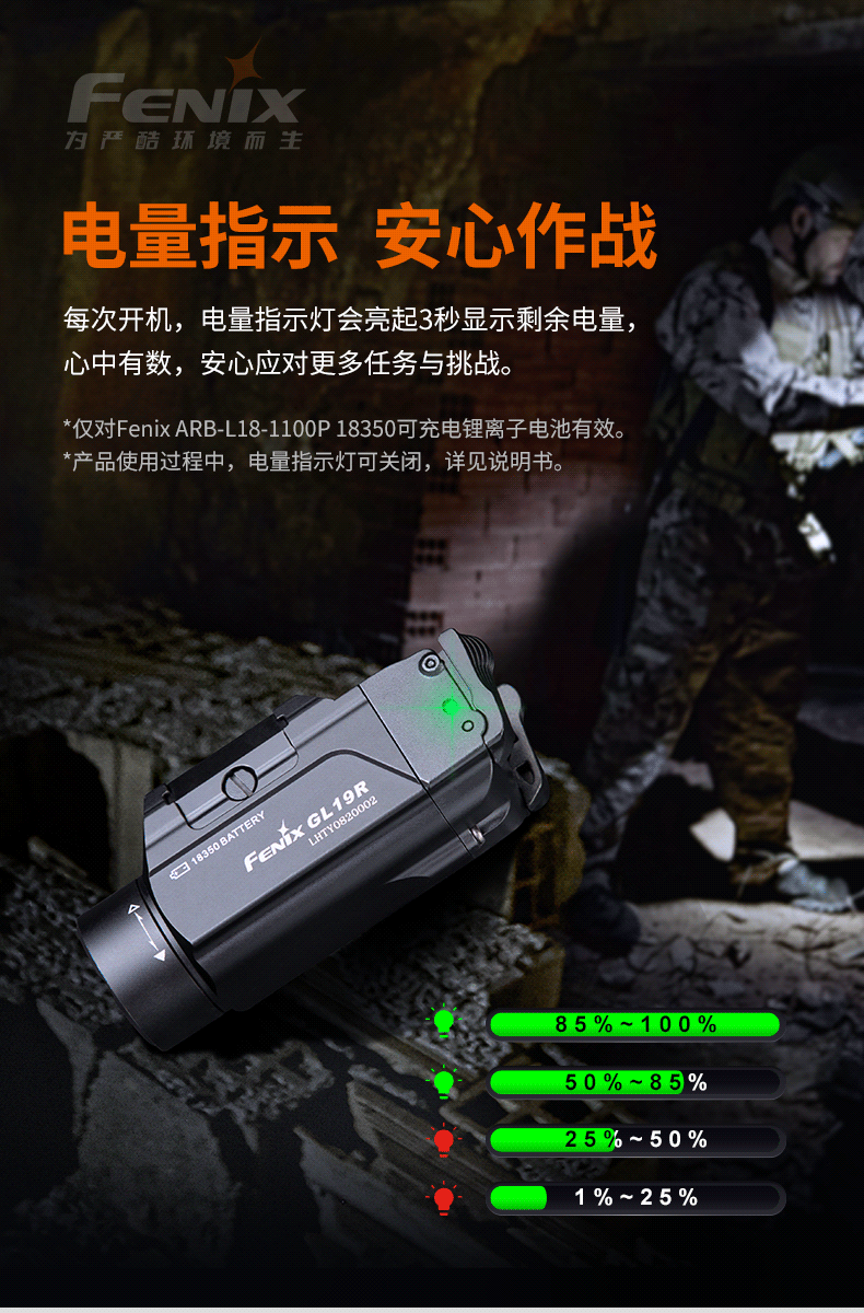 Fenix GL19R具备有智能保护电路板,有过流保护、过放保护、过充保护、过压保护、短路保护、高温充电保护这六重保护功能,再加上标配的一节高性能动力电池,在战术使用过程中更加安全与稳定。 同时具有强大的IP68级防护能力,不管是狂风暴雨、还是山林沼泽环境,都能多地形全天候适用,诠释了为严酷环境而生的品牌使命。