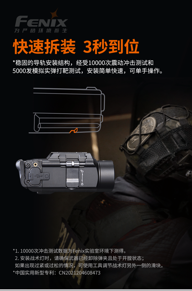 Fenix GL19R适用于Glock导轨和Picatinny(1913)导轨的装备,具有超强兼容的能力,在经受10000次震动冲击测试和5000发模拟实弹打靶测试后,导轨安装结构依旧稳固。同时GL19R还拥有专利快拆,在确保武器已经卸除弹夹且处于开膛状态后,3秒即可安装到位。